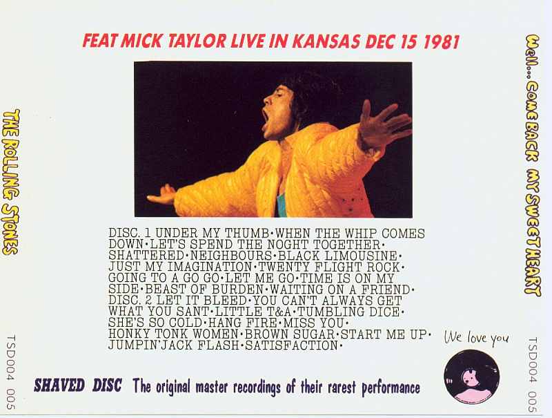 Bootleg comments: Released: 1995. Very Good Audience Recording. Mix of two shows, Featuring Mick Taylor from "Let Me Go up to "Little T&A". | |||||||||||||||||||||||||||||||||||||||||||||||||||||||||||