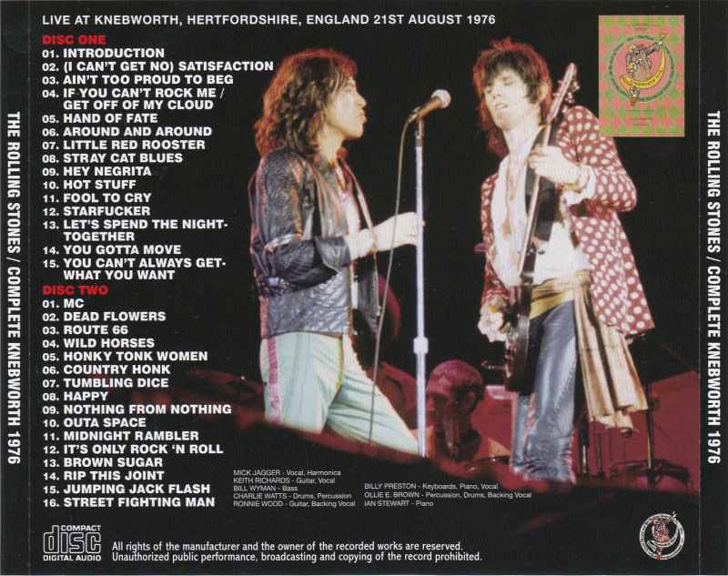 Bootleg comments: Released: 2025. Origin: Japan. MATRIX: E4094 Complete Knebworth 1976 - Disc 1 // E4094 Complete Knebworth 1976 - Disc 2 Mix of Excellent Soundboard and Audience recording. Complete show. 49th Anniversary Complete Edition REMASTERED BY GRAF ZEPPELIN Mainly using a new transcript from the Stereo Soundboard recording of "Hot August Night" 2LP including Pitch correction. The missing parts are filled in with mono Soundboard from the video audio source, and the parts that still can't be filled in are filled in with the order of multiple audiences such as "Stones Tour Mop Up" (2LP) and "Stoned Stones" LP. | |||||||||||||||||||||||||||||||||||||||||||||||||||||||||||||||||