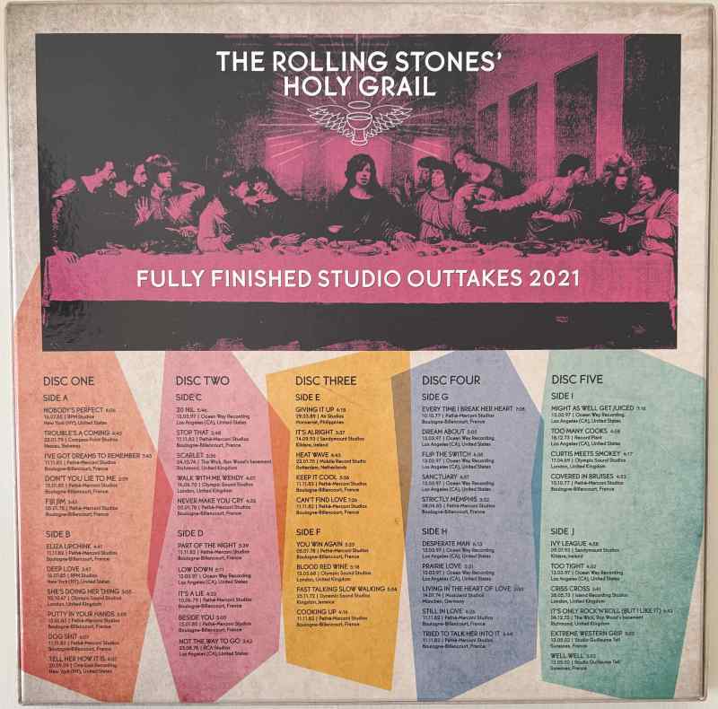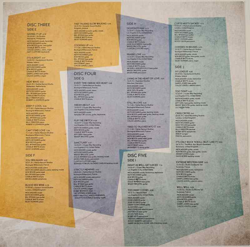 • 1985-07-16: RPM Studios, New York City, NY, Studio Session Track: 1 ( LP 1 ) Track: 22 ( LP 1 ) • 1979-01-22: Compass Point Studios, Nassau, Bahamas, Studio Session Track: 2 ( LP 1 ) • 1982-11-11: Pathé-Marconi Studios, Boulogne-Billancourt, France, Studio Session Track: 3 ( LP 1 ) Track: 21 ( LP 1 ) Track: 25 ( LP 1 ) Track: 2 ( LP 2 ) Track: 21 ( LP 2 ) Track: 4 ( LP 3 ) Track: 5 ( LP 3 ) Track: 24 ( LP 3 ) Track: 24 ( LP 4 ) Track: 25 ( LP 4 ) • 1985-01-15: Pathé-Marconi Studios, Boulogne-Billancourt, France, Studio Session Track: 4 ( LP 1 ) Track: 24 ( LP 1 ) Track: 24 ( LP 2 ) • 1978-01-05: Pathé-Marconi Studios, Boulogne-Billancourt, France, Studio Session Track: 5 ( LP 1 ) Track: 5 ( LP 2 ) Track: 21 ( LP 3 ) • 1967-07-02: Olympic Sound Studios, London, UK, Studio Session Track: 23 ( LP 1 ) • 2009-09-20: One East Recording Studio, New York City, NY, Studio Session Track: 26 ( LP 1 ) • 1997-03-13: Ocean Way Recording Studios, Los Angeles, CA, Studio Session Track: 1 ( LP 2 ) Track: 22 ( LP 2 ) Track: 2 ( LP 4 ) Track: 3 ( LP 4 ) Track: 4 ( LP 4 ) Track: 21 ( LP 4 ) Track: 22 ( LP 4 ) Track: 1 ( LP 5 ) Track: 22 ( LP 5 ) • 1974-10-04: The Wick, Richmond, UK, Studio Session Track: 3 ( LP 2 ) • 1970-06-16: Olympic Sound Studios, London, UK, Studio Session Track: 4 ( LP 2 ) • 1979-06-10: Pathé-Marconi Studios, Boulogne-Billancourt, France, Studio Session Track: 23 ( LP 2 ) • 1978-08-23: RCA Studios, Los Angeles, CA, Studio Session Track: 25 ( LP 2 ) • 1989-03-29: Air Studios, Montserrat, West Indies, Studio Session Track: 1 ( LP 3 ) • 1993-09-14: Sandymount Studios, St. Kildare, Ireland, Studio Session Track: 2 ( LP 3 ) Track: 21 ( LP 5 ) • 1975-01-22: RS Mobile Record Studio, Rotterdam, Holland, Studio Session Track: 3 ( LP 3 ) • 1968-05-13: Olympic Sound Studios, London, UK, Studio Session Track: 22 ( LP 3 ) • 1974-01-14: Musicland Studios, Munich, West Germany, Studio Session Track: 23 ( LP 3 ) Track: 23 ( LP 4 ) • 1977-10-10: Pathé-Marconi Studios, Boulogne-Billancourt, France, Studio Session Track: 1 ( LP 4 ) Track: 4 ( LP 5 ) • 1985-04-08: Pathé-Marconi Studios, Boulogne-Billancourt, France, Studio Session Track: 5 ( LP 4 ) • 1973-12-18: The Record Plant, Los Angeles, CA, Studio Session Track: 2 ( LP 5 ) • 1969-04-17: Olympic Sound Studios, London, UK, Studio Session Track: 3 ( LP 5 ) • 1973-05-28: Island Recording Studios, London, UK, Studio Session Track: 23 ( LP 5 ) • 1973-12-04: The Wick, Richmond, UK, Studio Session Track: 24 ( LP 5 ) • 2002-05-13: Guillaume Tell Studios, Suresnes, France, Studio Session Track: 25 ( LP 5 ) Track: 26 ( LP 5 ) | ||||||||||||||||||||||||||||||||||||||||||||||||||||||||||||||||||||||||||||||||||||||||||||||||||||||||||||||