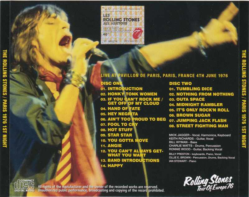 • 1976-06-04: Pavillon De Paris (Les Abattoirs), Paris, France, Live Concert Track: 1 ( CD 1 ) Track: 2 ( CD 1 ) Track: 3 ( CD 1 ) Track: 3 ( CD 1 ) Track: 4 ( CD 1 ) Track: 5 ( CD 1 ) Track: 6 ( CD 1 ) Track: 7 ( CD 1 ) Track: 8 ( CD 1 ) Track: 9 ( CD 1 ) Track: 10 ( CD 1 ) Track: 11 ( CD 1 ) Track: 12 ( CD 1 ) Track: 13 ( CD 1 ) Track: 14 ( CD 1 ) Track: 1 ( CD 2 ) Track: 2 ( CD 2 ) Track: 3 ( CD 2 ) Track: 4 ( CD 2 ) Track: 5 ( CD 2 ) Track: 6 ( CD 2 ) Track: 7 ( CD 2 ) Track: 8 ( CD 2 ) | ||||||||||||||||||||||||||||||||||||||||||||||||||