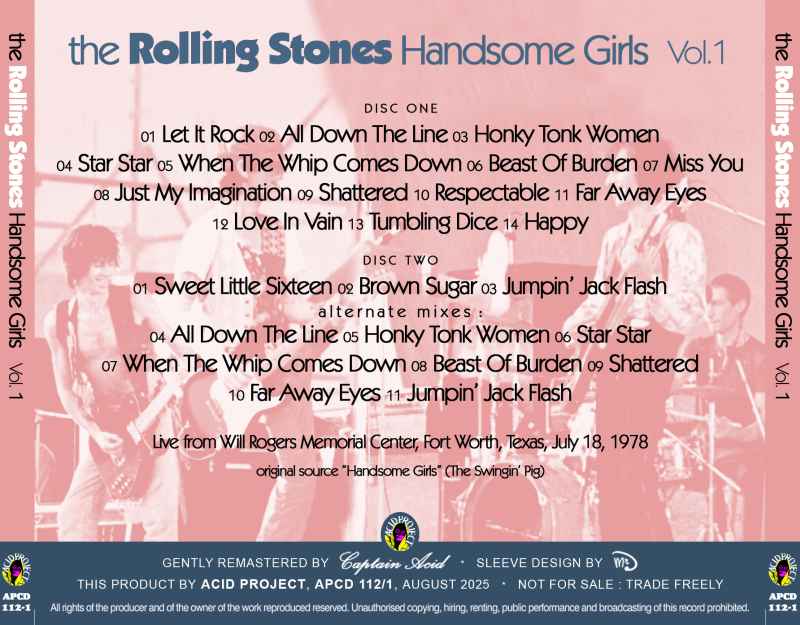 THE ROLLING STONES BLACK AND BLUE - REMASTERED & REIMAGINED FOR 2025! The Super Deluxe Box Set is stacked with unreleased recordings, a Blu-ray of rare performances, a 100-page book ft. exclusive photographs, and a replica ’76 tour poster - available to preorder now 1 Blu-Ray disc, featuring a new Steven Wilson mix of the album, unreleased outtakes, and a live recording from their 1976 Earls Court show. The Blu-Ray also includes a previously unreleased live TV recording from Paris and Dolby Atmos mixes. Release Date: 2025-11-14 Label: Polydor Format: Black and Blue Super Deluxe 5LP (180g Black & Marbled Blue Vinyl) Blu Ray (Colour) Boxset "WELCOME TO SHEPHERD’S BUSH" As The Rolling Stones were preparing to play two nights at Wembley Stadium in June 1999, their first London shows in 4 years, they announced a surprise show at London’s Shepherd’s Bush Empire for June 8, 1999. An intimate crowd of 1800 lucky fans were treated to a number of rarely heard gems over the course of 96 minutes. As Mick Jagger stated from the stage that night, “If you want to see the hits go to the big place down the road”. And as promised, the deep cuts were deep – “Melody” performed for the first time since 1977, while “Moon Is Up” was brought to the stage for the only time in the band’s live career. Sheryl Crow, who opened the show, joins the band during “Honky Tonk Women”. Release Date: 2024-12-06 Label: Universal Music Format: 2LP (Black Vinyl), BluRay+2CD, 4K-UHD "LIVE AT RACKET - NYC" Live At Racket, NYC features seven tracks the band performed at the intimate launch event on October 19, 2023, with debut live performances of “Angry,” “Bite My Head Off,” “Whole Wide World,” and “Sweet Sounds of Heaven (with Lady Gaga).” Previously only available as a bonus disc on the 2 CD Live Edition of Hackney Diamonds, the band’s first studio album of new material since 2005. Available on 180g heavyweight solid white vinyl for Record Store Day 2024.> Tracks: "Shattered", "Angry", "Whole Wide World","Tumbling Dice", "Bite My Head Off", "Jumpin' Jack Flash" and "Sweet Sounds of Heaven" – feat. Lady Gaga Release Date: 2024-04-20 Label: Universal Music Product code: 0602458959680 Format: 1LP (White Vinyl) ![]() HACKNEY DIAMONDS New album by The Rolling Stones, is released on October 20th on Polydor Records, marks the band’s first studio album of original material since 2005's A Bigger Bang. Release Date: 20 October 2023 Label: Polydor Records Product code: LC 00309. 554 645-9 Format: 1LP (Blue Vinyl) by Ralph Sutherland and Harold Sherrick, Genius Music Books 2021, 336 pages, A4 landscape. Excellent book, highly recommended to all Bootlegs fans. If you want to read about how legendary Stones bootlegs were recorded, get this book ! Discover the secret history of Trade Mark of Quality, the first bootleg record label. This book is essential for bootleg record collectors. A 336 full color pages with a complete discography of the entire TMQ catalog of over 100 LPs and EPs well over 350 images of the albums, colored vinyl, and inserts the underground tale of how Trade Mark of Quality came into being. Included in A Pig’s Tale is not only the Trade Mark of Quality and Pigman saga, but reproductions of all the rubber stamped and illustrated album jackets from every genuine TMQ record release, including the earliest releases from ’69 right up to the last titles in 1976. Everything you ever wanted to know about the real TMQ label is here. Get it here ![]() The Rolling Stones concluded their three-month Hackney Diamonds tour across North America with a final performance Sunday night at the New Thunder Ridge Nature Arena at Big Cedar Lodge in Ridgedale, Missouri. This 20,000-seat outdoor amphitheater, nestled in the Ozarks, my wife knows everything about it. More info here: Setlist performing new songs like "Whole Wide World", "Bite My Head Off" and "Sweet Sounds Of Heaven", from the new album. More info here: Setlist Officially released on CD by Polydor Records. 2023. Complete show. LC 00309. 588 029-6 August 30, 2019. Hard Rock Stadium, Miami, FL. The Rolling Stones Finish Off No Filter 2019 Tour in Miami Ahead of Hurricane Dorian. More info here: Setlist "Live at The Wiltern 2002" The Rolling Stones have announced the release of a new live album from their 2002-03 Licks World Tour, celebrated the band's 40th anniversary. The Rolling Stones Live at the Wiltern features the band's Nov. 4, 2002, complete set from Los Angeles' Wiltern Theatre. More info here: Setlist The release includes a 20-song set that features many classic songs. Starting with "Jumpin' Jack Flash," the performance includes "Beast of Burden," "Can't You Hear Me Knocking," "Honky Tonk Women" and "Start Me Up" before ending with an encore of "Tumbling Dice." There’s a 3LP vinyl edition of Live At The Wiltern as well, including a bronze and black ‘swirl’ version available from independent retailers. Release Date: 8 March 2024 Label: Eagle Rock/Universal Product code: 0602455710826 Format: 3LP (color Vinyl, Bronze & Black Swirl) 2CD+Blu-ray 2CD+DVD Forty Licks! The Definitive Greatest Hits Collection on 4LP Originally released in 2002 to commemorate their 40th anniversary as a band, Forty Licks was a huge commercial success selling over 7 million copies round the world. Widely regarded as their definitive career spanning best of compilation Forty Licks is released on limited 4 x 180g black vinyl housed in a wide spined gatefold sleeve. Also available on digital and in Dolby Atmos, with three tracks new to streaming. Release Date: 28 July 2023 Label: UMR Product code: Format: 4LP . "GRRR Live! - Live At Newark" The definitive concert film recorded on one of the most memorable shows in the Rolling Stones history. The 50 & Counting tour featured guest appearances from The Black Keys, Gary Clark Jr, Lady Gaga, John Mayer, Bruce Springsteen and Mick Taylor. Release Date: 10 February 2023. Label: Mercury Studios Product