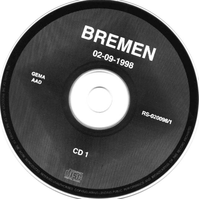 Bootleg comments: Released: 1998. Origin: Europe. MATRIX: Bremen 1 // Bremen 2 Excellent Stereo soundboard recording. taken from TV/ Radio Broadcast. Incorrect track information on back cover. Track 1 CD2. | |||||||||||||||||||||||||||||||||||||||||||||||||||||