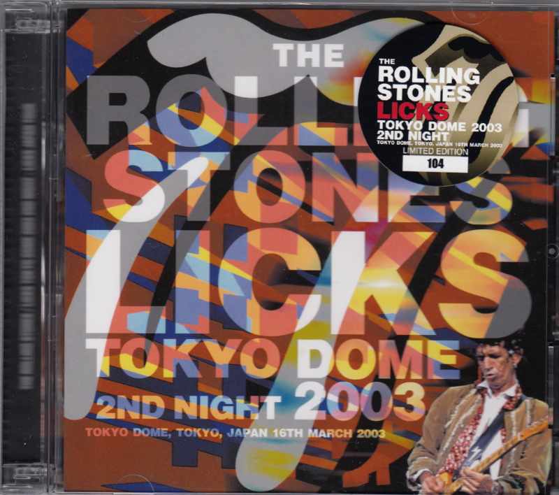 Bootleg comments: Released: 2014. Origin: Japan. MATRIX: LICKS TOKYO DOME 2N 2003 Disc-1 // LICKS TOKYO DOME 2N 2003 Disc-2 Excellent Stereo Audience recording. Complete show. Limited edition with numbered sticker on front. Disc 1 starts with a 9 min. long Pre -show Music Track (Low sound level). | |||||||||||||||||||||||||||||||||||||||||||||||||