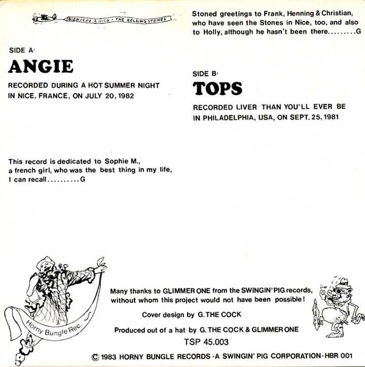 Bootleg comments: Released: 1983. Origin: Germany. MATRIX: ST 45003-A-HR // ST 45003-B1 7" Single 45 RPM. Limited edition of 500 copies. Good to Very Good Mono Audience recording. Collaboration with GLIMMER ONE from the SWINGIN' PIG records, cover Design By G. The Cook. | |||||||