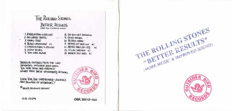 Bootleg comments: Released: 1994. Origin: Japan. MATRIX: TTFLT 305 023-1 U 456 Excellent Stereo Soundboard recording. Some Girls Demos & Outtakes. Limited edition of 300 numbered copies. | |||||||||||||||||||||||||||||||